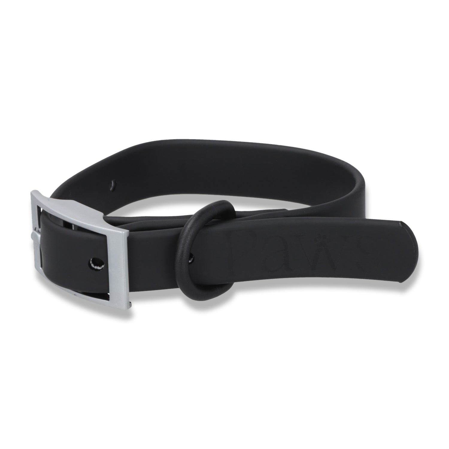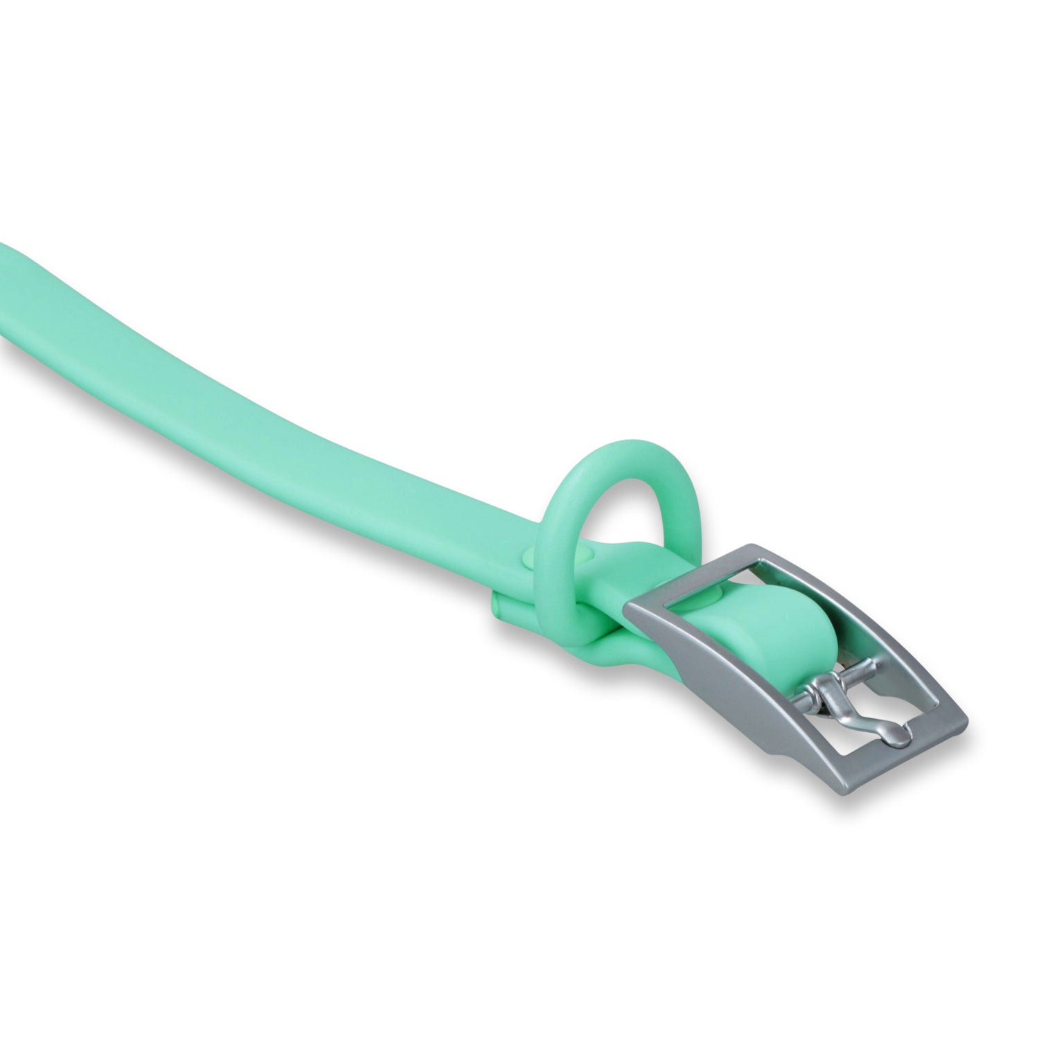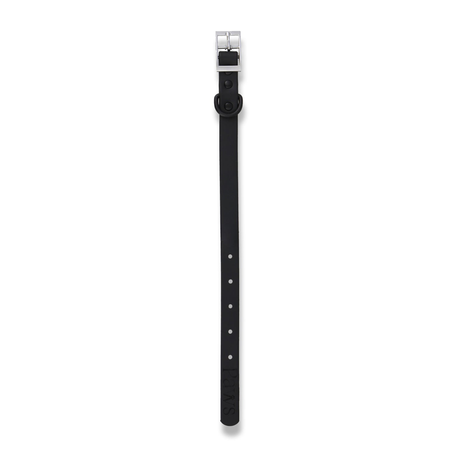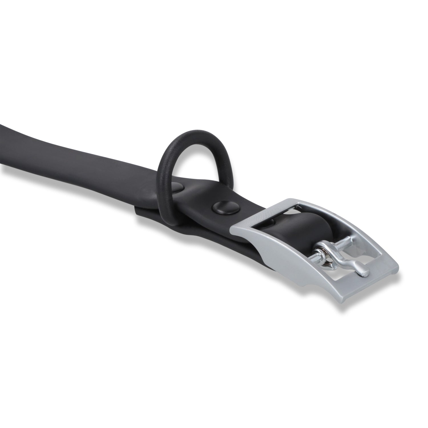 PVC premium impermeable + hebilla de acero galvanizado + anillo metálico para placa y correa.